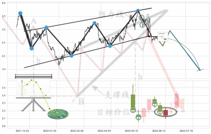 ➢ 【卖0】上涨趋势线在→(2022-06-01: 5.35 )被突破,反转趋势形成