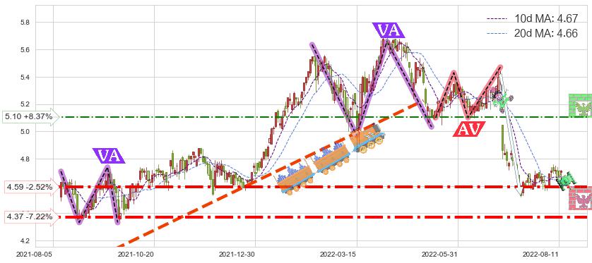 ♘ 阻力价格位5.10,可信任强度54.37%,距离最后交易2022-08-12形成的收盘价格4.71相差 +8.37%