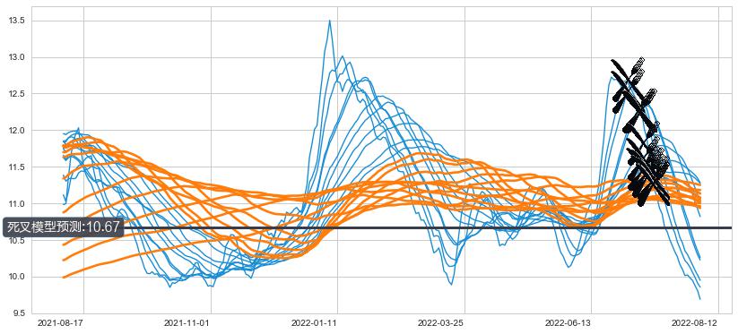 ➣ 70小时均线于(2022-07-18: 11.24)形成【死叉】基于【死叉历史模型】预测死叉后最低波谷价格: 10.25, 死叉后最低价格9.57,已经下跌超出预测最低波谷价格, 预期反弹