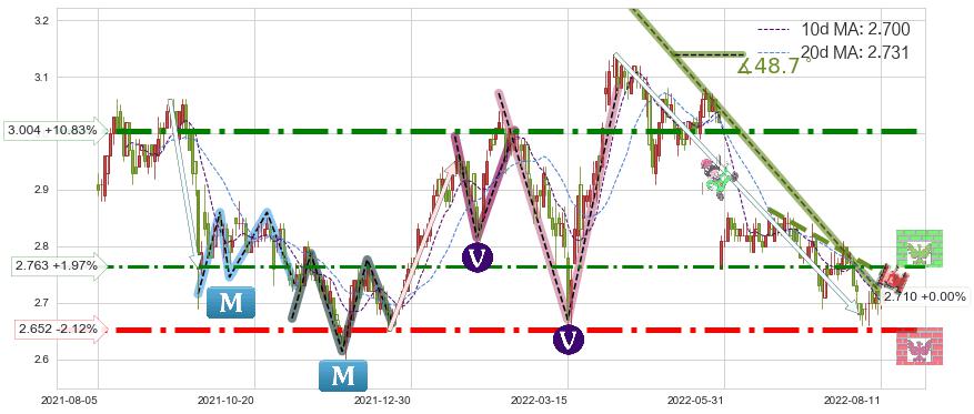 ♘ 阻力价格位2.763,可信任强度61.89%,距离最后交易2022-08-12形成的收盘价格2.710相差 +1.97%