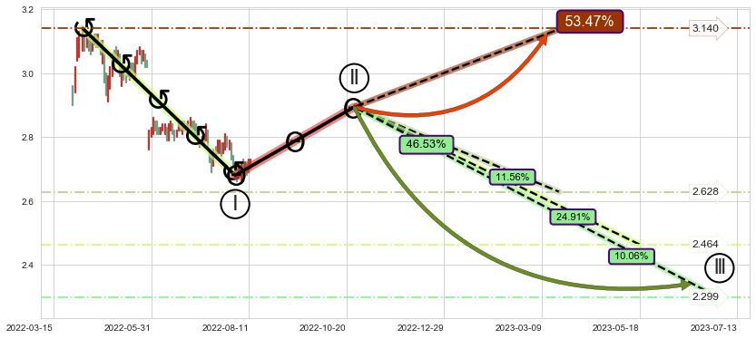 ➢ 循环浪继续向下【最高】位置(2023-03-22, 2.628),匹配聚类样本比例24.84%, 可能性概率11.56%