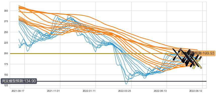 ➣ 144小时均线于(2022-08-05: 181.32)形成【死叉】基于【死叉历史模型】预测死叉后最低波谷价格: 99.62, 死叉后最低价格169.60,尚未达到预测最低波谷价格, 预期继续下跌