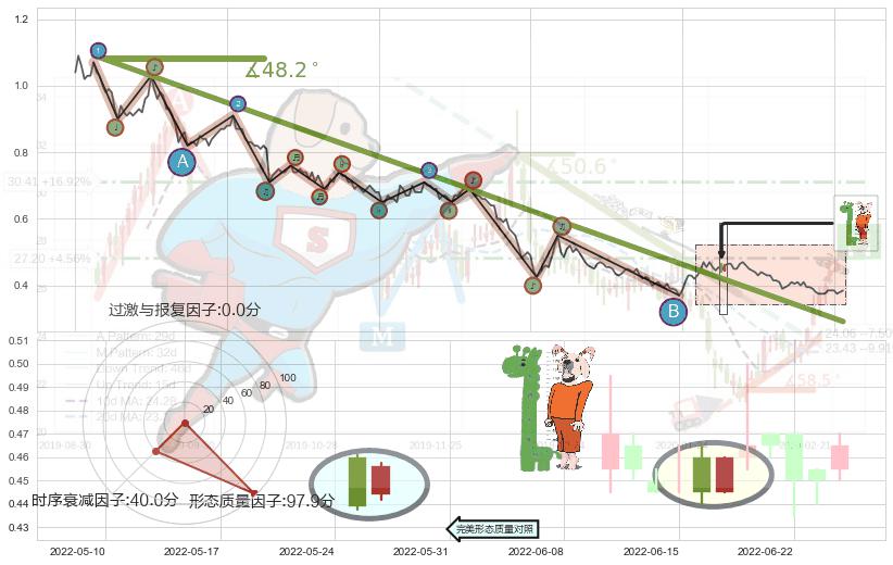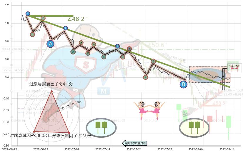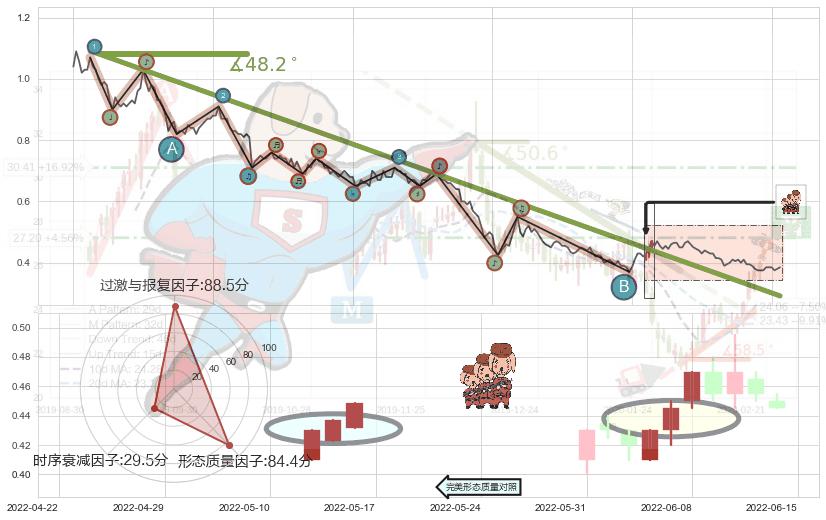 从2021-08-11至2022-06-07,共包含201个交易日,阶段股价下跌-79.12%,阶段股价变动位移路程比: 1 : 5,下跌趋势角度: 48.2