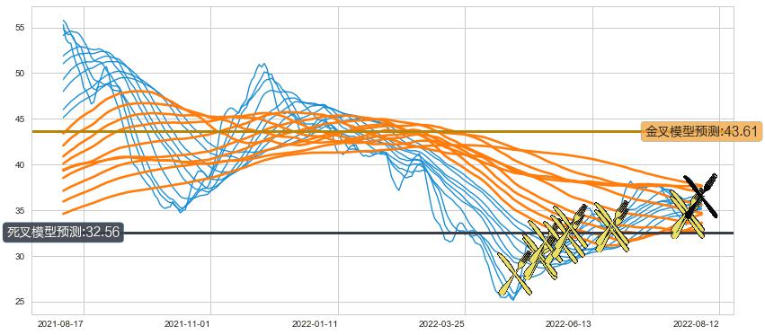 ➣ 34小时均线于(2022-08-11: 36.46)形成【死叉】基于【死叉历史模型】预测死叉后最低波谷价格: 32.38, 死叉后最低价格36.05,尚未达到预测最低波谷价格, 预期继续下跌