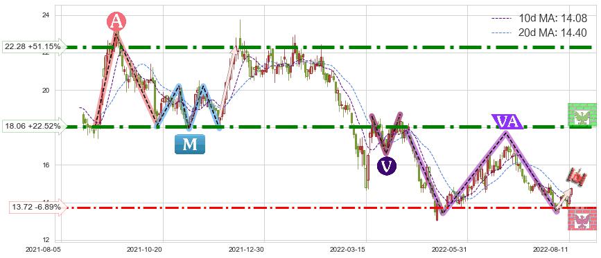 ♘ 阻力价格位18.06,可信任强度95.71%,距离最后交易2022-08-12形成的收盘价格14.74相差 +22.52%