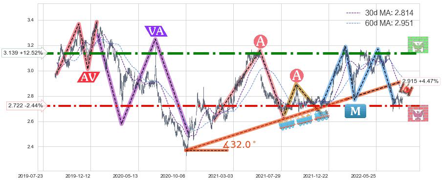 ♞ 30日均线:2.814,60日均线:2.951→ 快线<慢线