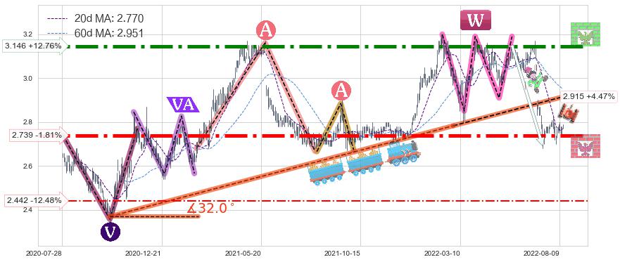 ♘ 支撑价格位2.739,可信任强度96.35%,距离最后交易2022-08-12形成的收盘价格2.790相差 -1.81%