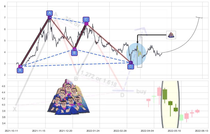 ➣ 谐波伽利:c下跌到达d:猜想拉升 → 上涨 →【拐点】强支撑临近 → 大趋势均值回复