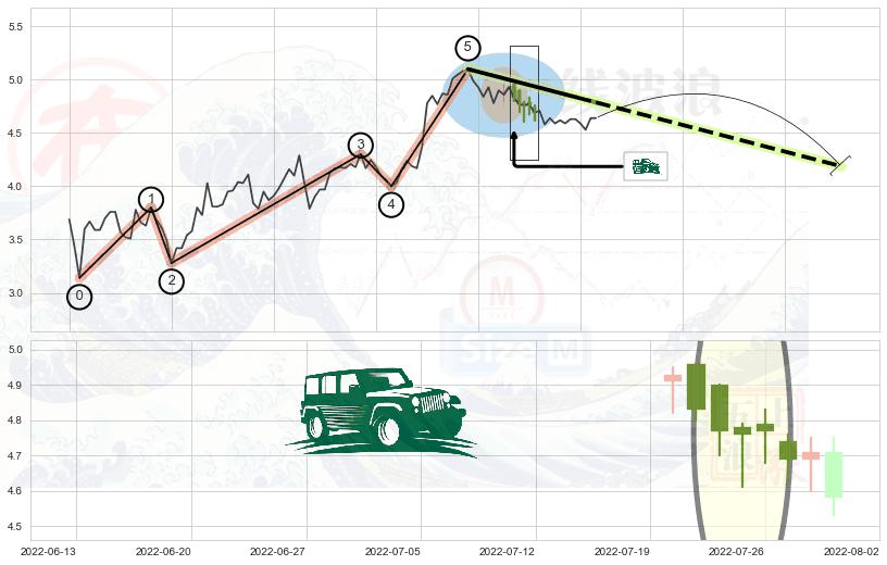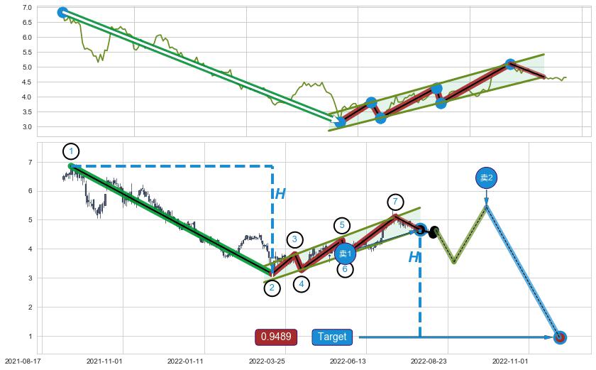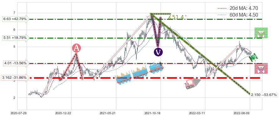 ♘ 阻力价格位6.63,可信任强度57.87%,距离最后交易2022-08-12形成的收盘价格4.64相差 +42.79%