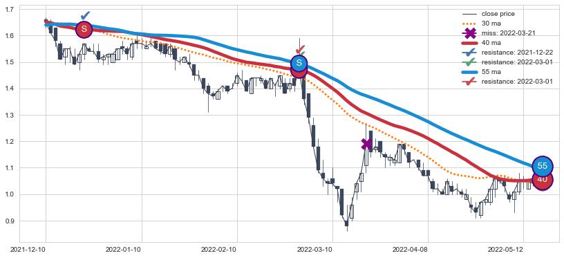 ➣ 55小时均线于(2022-05-27: 1.0518)形成【金叉】基于【金叉历史模型】预测金叉后最高波峰价格: 2.138, 金叉后最高价格1.3400,尚未达到预测最高波峰价格, 预期继续上涨