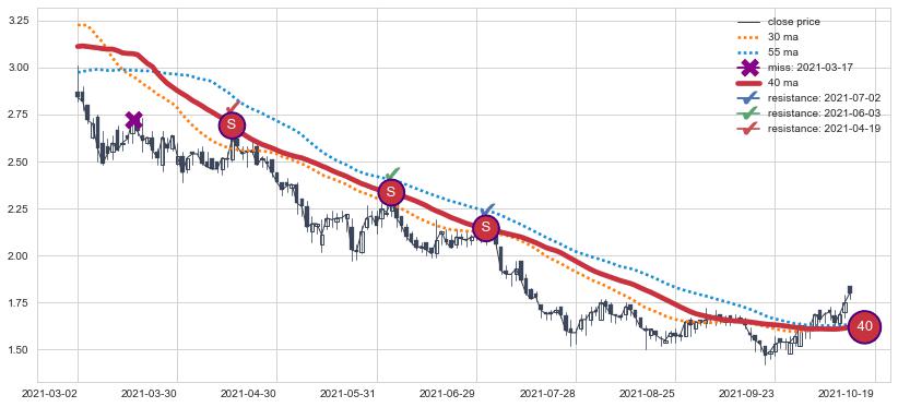 ➢ 最优均线组合共正确确认支撑阻力信号10处,正确确认率 71.43%