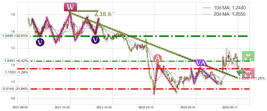 ♘ 阻力价格位1.2451,可信任强度61.88%,距离最后交易2022-08-12形成的收盘价格1.1700相差 +6.42%
