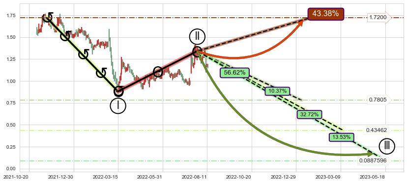 ➣ 循环浪继续向下【平均值】位置(2023-03-14, 0.43462),匹配聚类样本比例57.78%, 可能性概率32.72%