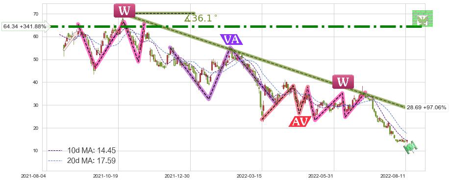 ♘ 阻力价格位64.34,可信任强度96.90%,距离最后交易2022-08-12形成的收盘价格14.56相差 +341.88%