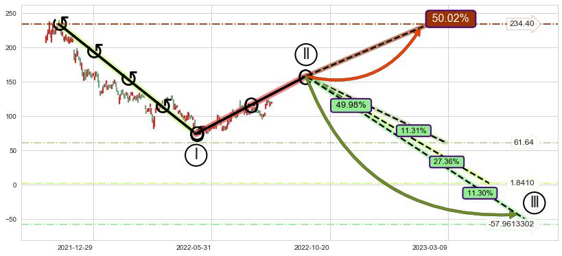 ➢ 高概率大级别循环下跌浪被破坏,反转向上(突破5浪起点)概率50.02%