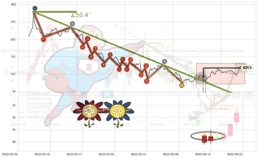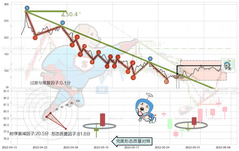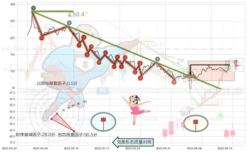 从2021-09-17至2022-06-07,共包含173个交易日,阶段股价下跌-97.76%,阶段股价变动位移路程比: 1 : 6,下跌趋势角度: 50.4