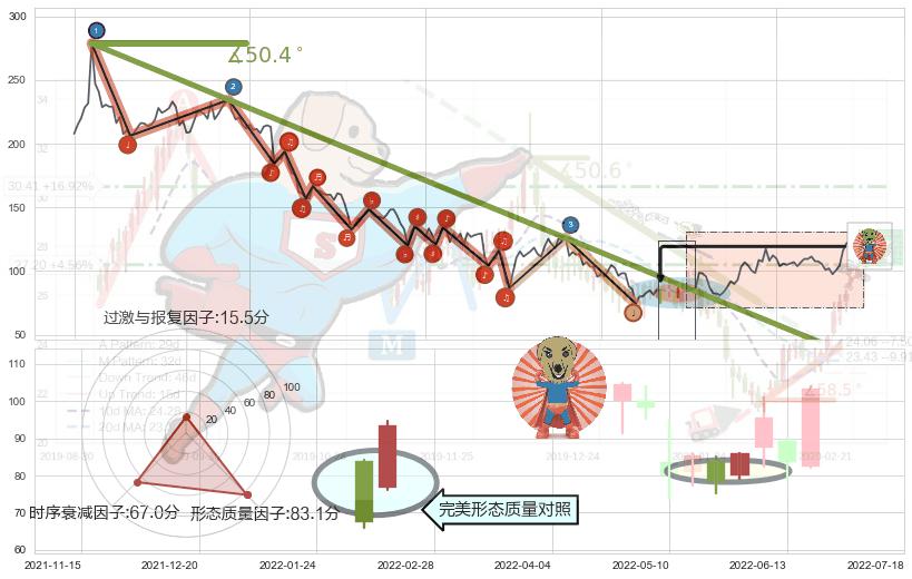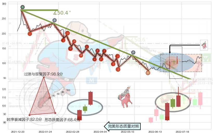 从2021-09-17至2022-03-23,共包含126个交易日,阶段股价下跌-74.44%,阶段股价变动位移路程比: 1 : 5,下跌趋势角度: 56.2