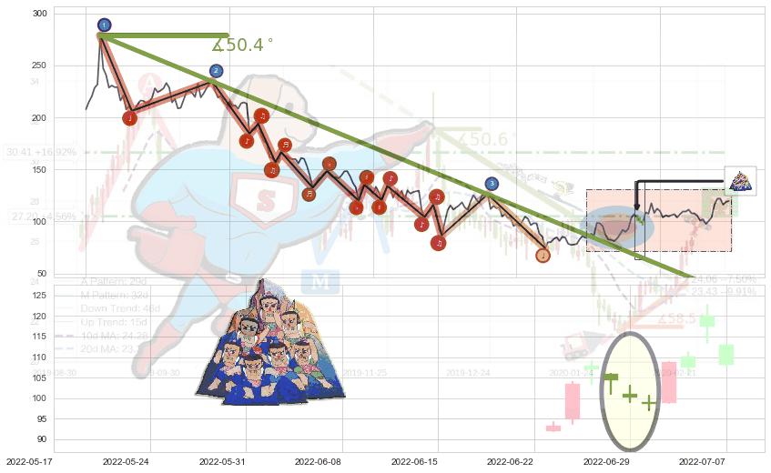 ➣ 2021-09-17-2022-06-07下跌趋势存在反转上涨[机会],其原下跌趋势的阻力位(31.05)已被突破[强支撑信号],原下跌趋势角度: 50.4˚
