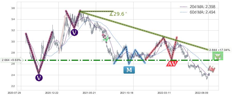 ♘ 阻力价格位2.664,可信任强度84.87%,距离最后交易2022-08-12形成的收盘价格2.430相差 +9.63%