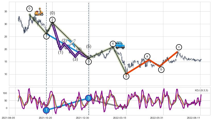 ➣ 波浪理论:猜想达到c点后小反弹终止反转下跌 → 下跌 → 【拐点】临近 → 阶段均值回复结束后继续大周期趋势跟踪