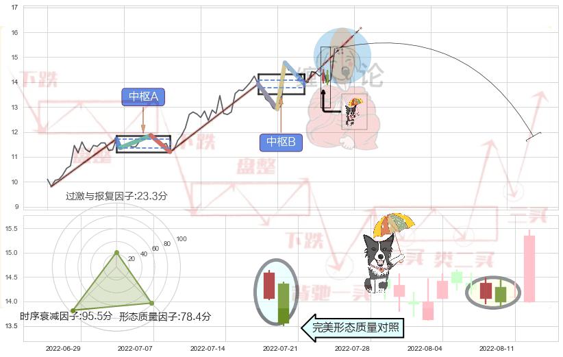 ➢ 【中枢B】:2022-07-15-2022-08-02,中枢由4笔构成,共13交易日, ZG=13.94, ZD=13.92