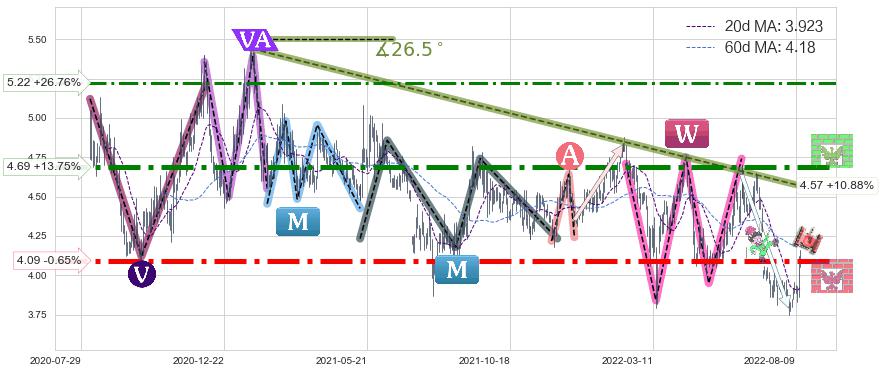 ♘ 支撑价格位4.09,可信任强度87.76%,距离最后交易2022-08-12形成的收盘价格4.12相差 -0.65%