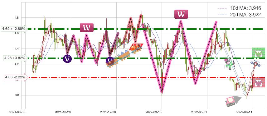 ♘ 阻力价格位4.28,可信任强度77.60%,距离最后交易2022-08-12形成的收盘价格4.12相差 +3.82%