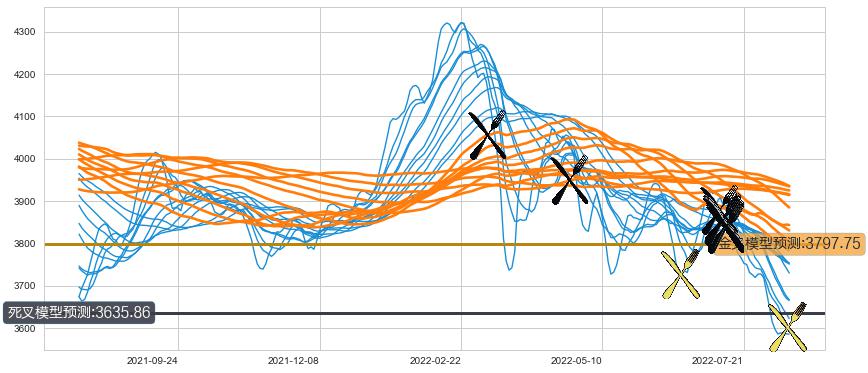 ➣ 40小时均线于(2022-07-11: 3852.32)形成【死叉】基于【死叉历史模型】预测死叉后最低波谷价格: 3636.83, 死叉后最低价格3537.68,已经下跌超出预测最低波谷价格, 预期反弹