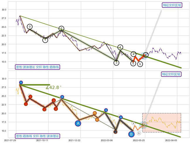 ➢ 波浪理论与趋势线信号事件周期长度级别相同,同周期信号事件