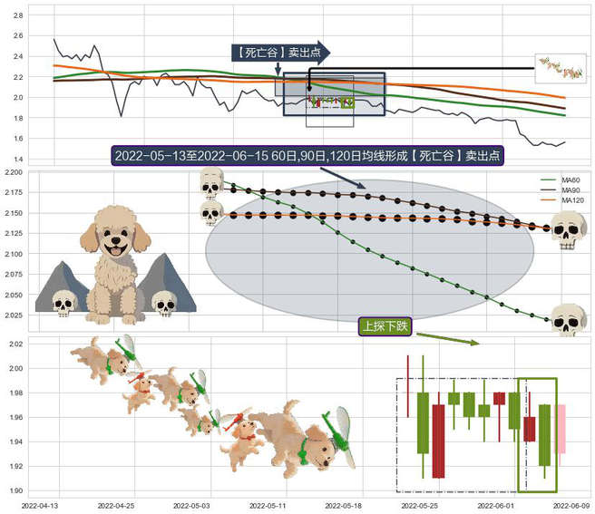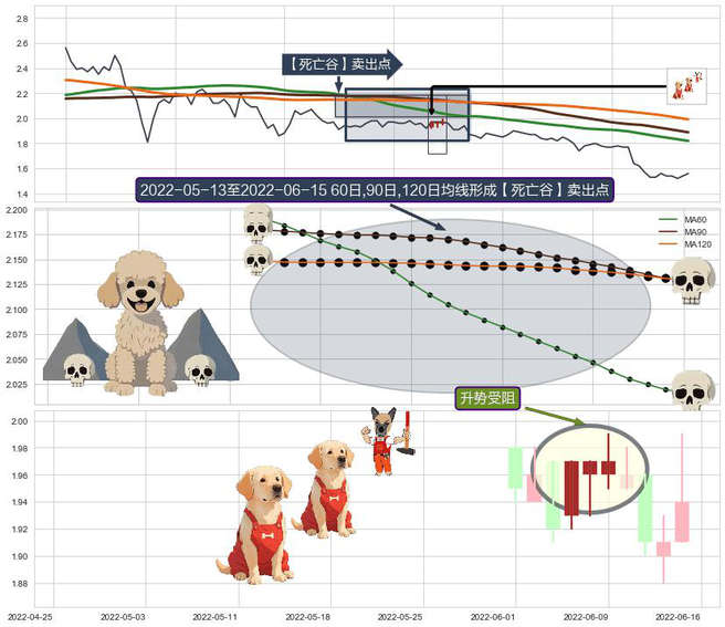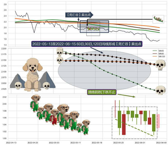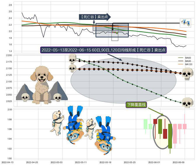 ➣ 2022-05-16-日至2022-06-15-日显现 60日-90日-120日均线 【死亡谷】卖出点 看空信号,后市看跌,卖出