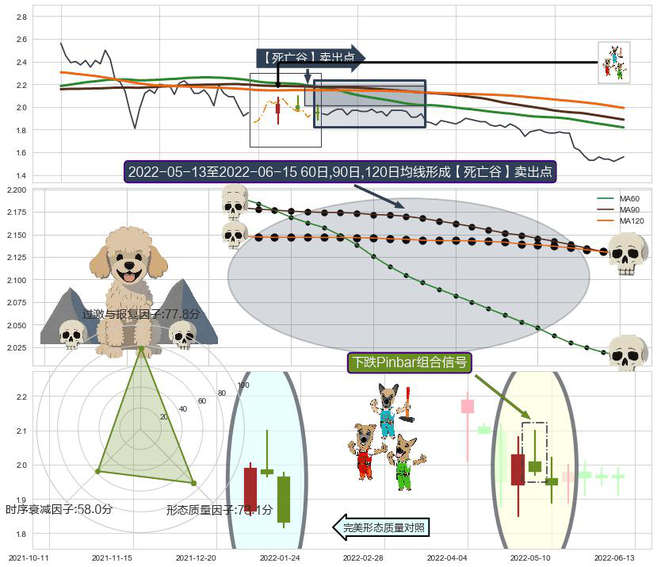 ➣ 下跌Pinbar组合信号 + 【死亡谷】卖出点死亡谷均线交叉卖出点信号叠加后【目标达成率】低,【看空】信号叠加【存续影响大】