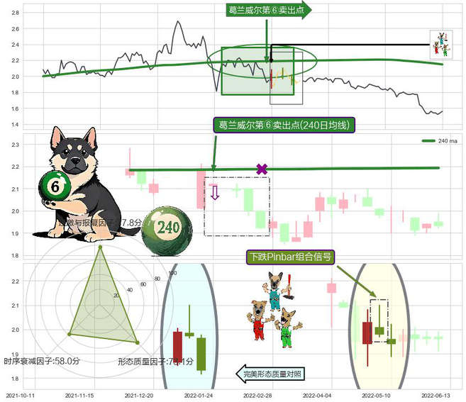 ➣ 下跌Pinbar组合信号 + 葛兰威尔第⑥卖出点葛兰威⑥卖:趋势逆转拐点信号叠加后【目标达成率】极低,【看空】信号叠加【存续影响极大】