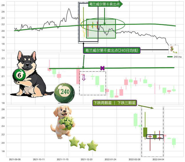 ➣ 2022-04-11-日显现 葛兰威尔均线 240日均线 第⑥卖出点 走势反转见顶信号,后市看跌,卖出信号