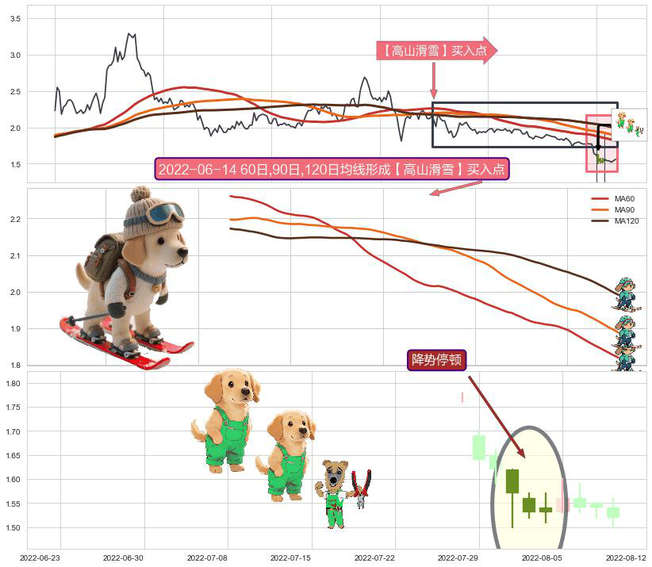 ➣ 2022-04-06日-2022-08-12日显现 60日-90日-120日均线 【高山滑雪】买入点 看多信号,后市看涨,买入