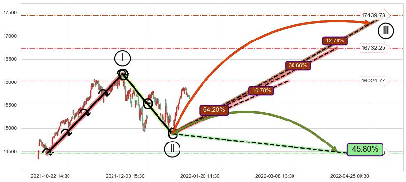 ♘ 支撑价格位15056.71,可信任强度97.09%,距离最后交易2021-12-31 15:30形成的收盘价格15645.00相差 -3.76%