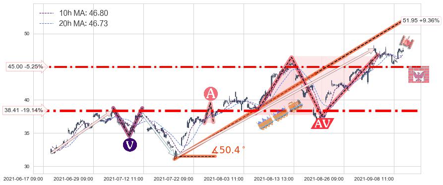 从2021-07-19 09:00至2021-09-09 14:00,共包含229个小时,阶段股价上涨43.61%,阶段股价变动位移路程比: 1 : 4