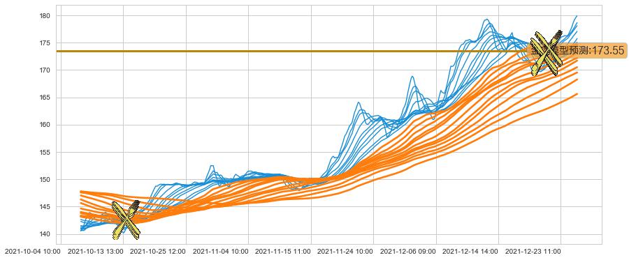 ➣ 70小时均线于(12-22 09:00: 173.98)形成【金叉】基于【金叉历史模型】预测金叉后最高波峰价格: 182.24, 金叉后最高价格180.33,尚未达到预测最高波峰价格, 预期继续上涨