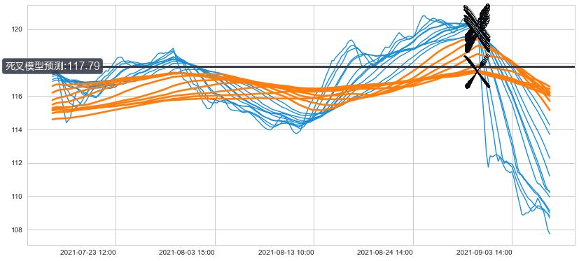 ➢ 70小时均线于(08-31 14:00: 119.59)形成【死叉】基于【死叉历史模型】预测死叉后最低波谷价格: 116.72, 死叉后最低价格107.20,已经下跌超出预测最低波谷价格, 预期反弹