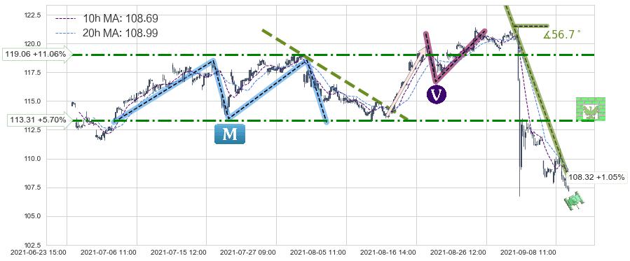 ♘ 阻力价格位113.31,可信任强度59.19%,距离最后交易2021-09-09 14:00形成的收盘价格107.20相差 +5.70%
