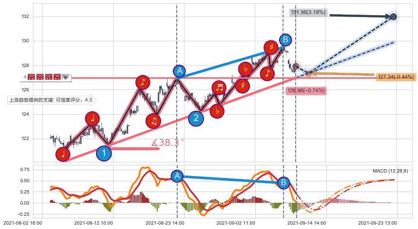 ♘ 阻力价格位129.22,可信任强度73.03%,距离最后交易2021-09-09 14:00形成的收盘价格127.91相差 +1.02%