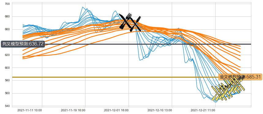 ➢ 90小时均线于(12-01 13:00: 671.39)形成【死叉】基于【死叉历史模型】预测死叉后最低波谷价格: 646.05, 死叉后最低价格540.75,已经下跌超出预测最低波谷价格, 预期反弹