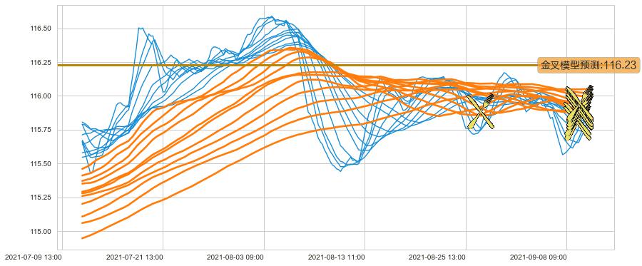 ➣ 70小时均线于(09-09 09:00: 115.90)形成【金叉】基于【金叉历史模型】预测金叉后最高波峰价格: 116.25, 金叉后最高价格116.14,尚未达到预测最高波峰价格, 预期继续上涨