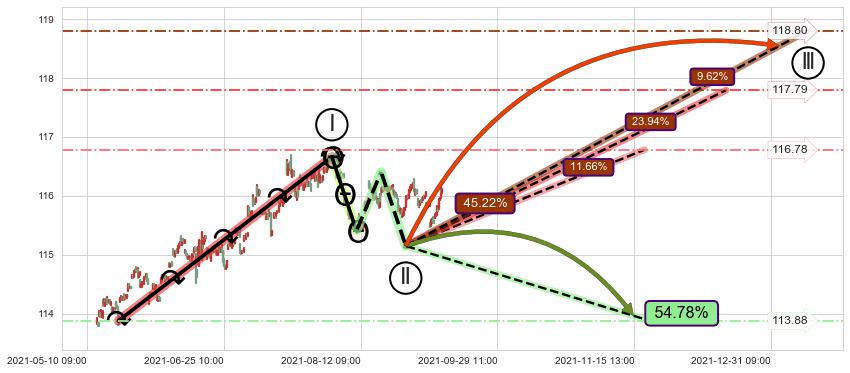 ➣ 循环浪继续向上【平均值】位置(12-16:09, 117.79),匹配聚类样本比例52.93%, 可能性概率23.94%