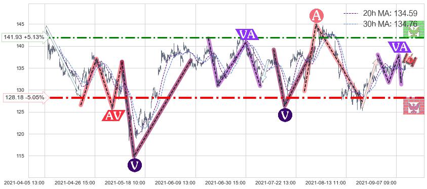 ♘ 阻力价格位141.93,可信任强度63.00%,距离最后交易2021-09-09 15:00形成的收盘价格135.00相差 +5.13%