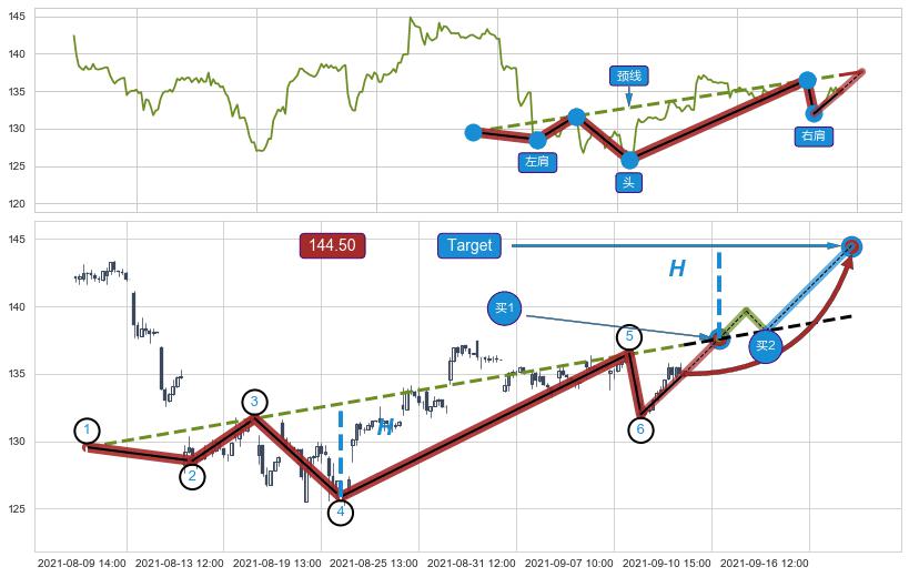 ➢ 头肩底:猜想临近关键阻力位突破点 → 临近拐点上涨 → 机会信号 → 大趋势均值回复