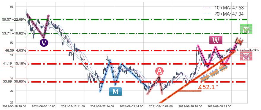 ♘ 阻力价格位53.71,可信任强度68.91%,距离最后交易2021-09-09 14:00形成的收盘价格48.55相差 +10.62%