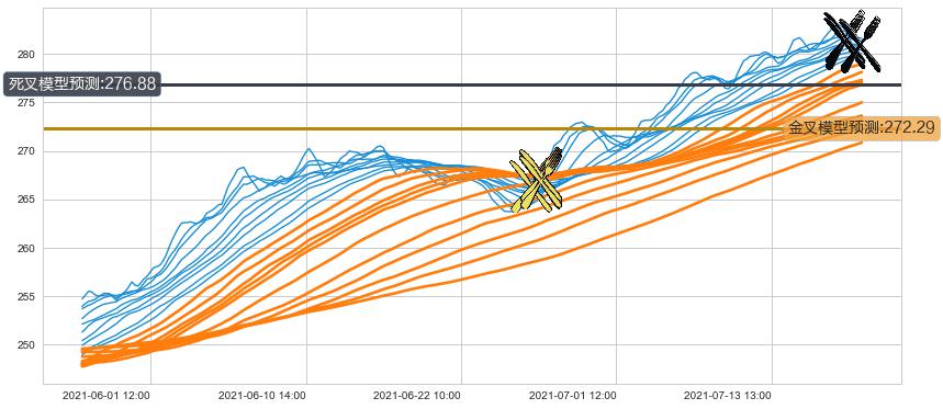 ➢ 60小时均线于(06-25 15:00: 266.94)形成【金叉】基于【金叉历史模型】预测金叉后最高波峰价格: 271.20, 金叉后最高价格283.37,已经上涨超出预测最高波峰价格, 预期回调