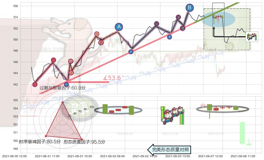 ➢ 2021-08-17 11:00-2021-09-02 13:00上升趋势存在反转[风险],其原上升趋势的支撑位(157.43)已破位[强阻力信号],原上升趋势角度: 53.6˚