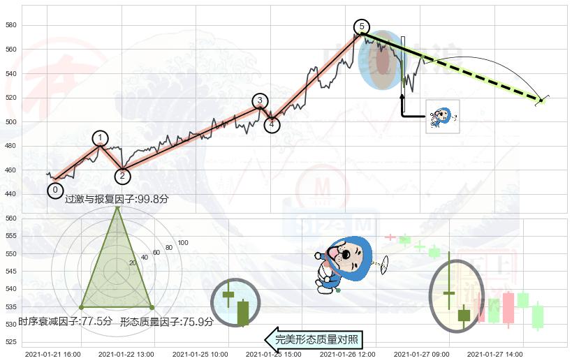 从2021-01-27 16:00至2021-01-28 16:00,共包含9个小时,阶段股价上涨4.38%,阶段股价变动位移路程比: 1 : 1.6