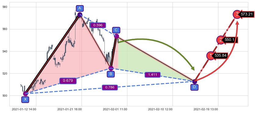 ➢ 距离预测D点位置有足够的下跌空间, 与看涨【伽利】形态相反,实际方向【看跌】